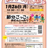 【親子の広場】 ~節分ごっこで遊んじゃおう!~ ♢日 時:1/26(月)10:30~11:30 ♢トレーニングルームにて ♢対 象:0才~未就園児とその保護者 ♢参加費:200円 ♢大人も子どもも動きやすい服装でご参加ください。 詳細はチラシをご覧ください。