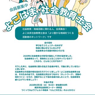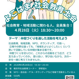 イベント情報 4月28日 社会教育・地域活動に関わる人、全員集合! ★仲間づくりを通した活動を考えよう仲間づくりを通した活動を考えよう 日時:2026年4月28日(火)18:30~20:00 会場:横浜市社会教育コーナー 研修室A 、参加費:500円 対象:NPO・自治会・PTA・ボランティアなど地域で活動をしている人 2026.02.01 イベント情報