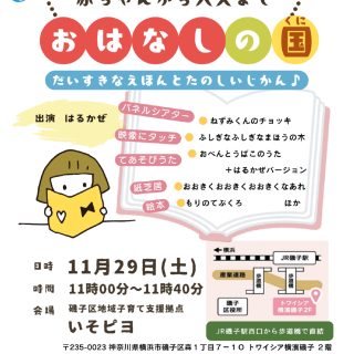 はるかぜによる紙芝居、パネルシアター、映像にタッチなどでお楽しみください! はるかぜバージョンの「おべんとうばこのうた」は毎回大人気です! ♦11月29日(土) 11時~  ♦予約不要 参加費無料  どなたでもご参加できます。
