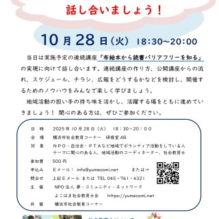 よこはま社会教育士会の交流会です。 実施予定の連続講座「布絵本から読書バリアフリーを知る」の実現に向けて話し合います。 連続講座の作り方、公開講座からの流れ、スケジュール、チラシ、広報をどうするかなどを検討し、開催するためのノウハウをみんなで楽しく学びましょう。 地域活動の担い手の持ち味を活かし、活躍する場をともに進めていきましょう!